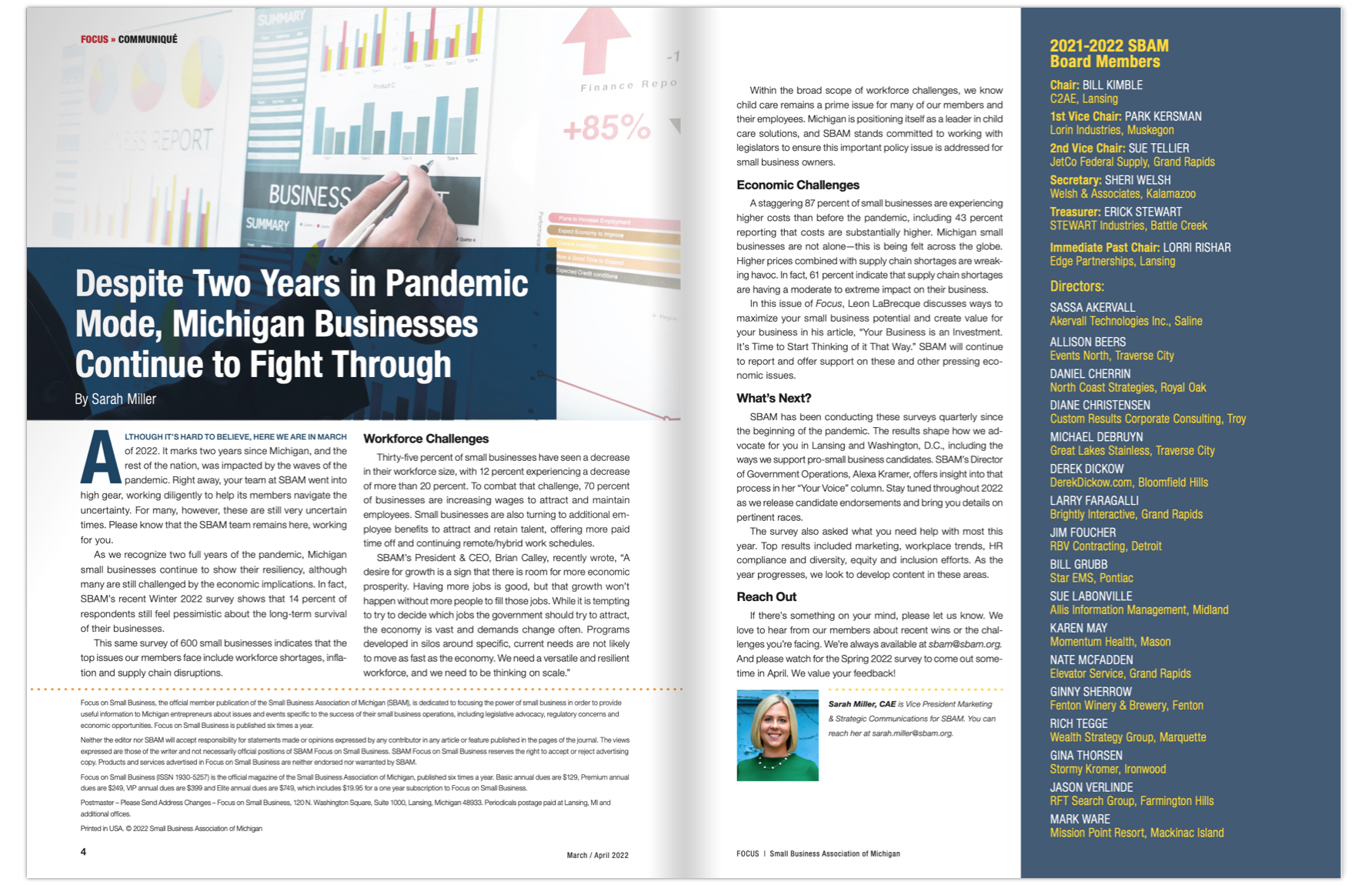 SBAM Focus on Small Business Magazine brings hands-on advice to becoming a more successful small business entrepreneur. This publication is sent to the associations members on a bi-monthly basis featuring four unique covers distributed based on region.